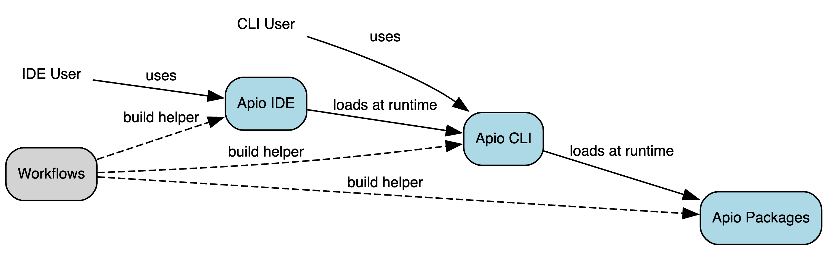 The following diagram shows the dependencies between the repos. At build time, the apio-workflows repos provides common actions to the build workflows in the the other repos. At runtime, the Apio IDE app loads the Apio CLI app, which loads the individual Apio packages that are used on that platform.