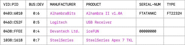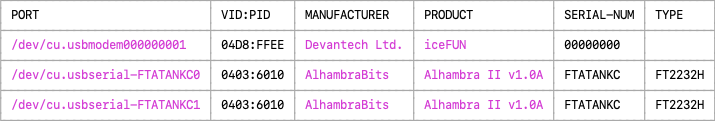 On Windows, manufacturer and product strings of FTDI based devices may show their FTDI generic values rather than the custom values such as 'Alhambra II' set by the device manufacturer.