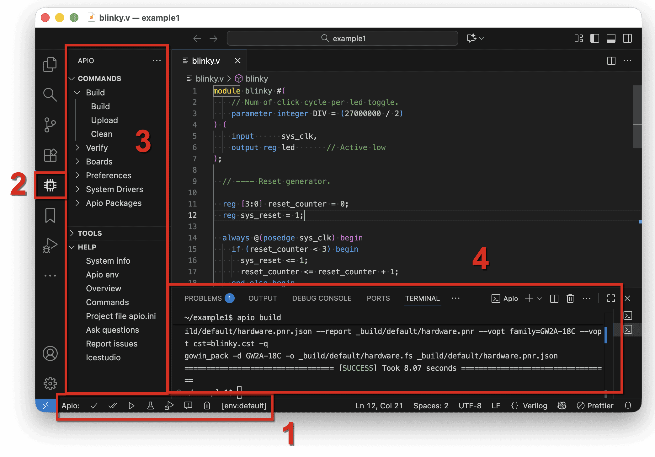 fpgawars.apio1(Apio FPGA). - This concludes the installation of the Apio IDE. The screenshot below shows the components of the Apio IDE.